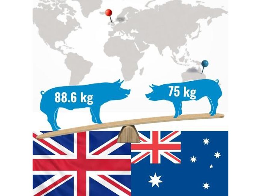 The average UK carcass weighs in at 88.6 kg while the Australian carcass comes in 13.6 kg lighter at 75 kg. Carcass weights are less to do with genetics and more to do with consumer demand, the Aussie market demands a smaller, leaner pig. If this trend was to change and a larger carcass would be accepted in the market Aussie pig farmers would see an increase in revenue for very little outlay.